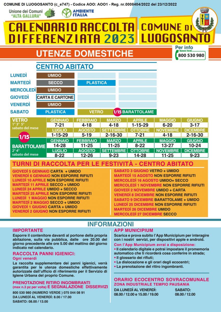 calendario per centro abitato, agro e attività commerciali